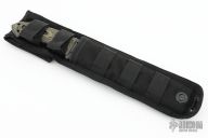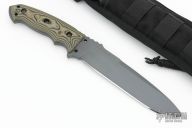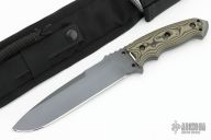 This Hogue fixed blade is an Allen Elishewitz design, it features a grey coated drop point blade with swedge and notched thumb rest, .234" blade stock and 1.434" blade depth, full tang construction. The handle has black/green, gray G10 scales over full tang construction with exposed tang glass breaker pommel. Includes nylon sheath and the original box. Light sheathing marks are visible on the blade otherwise the knife is in Excellent condition.