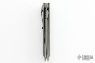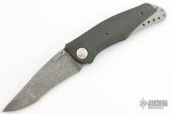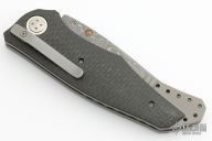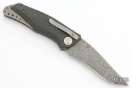 This Warlock Linerlock folder by Allen Elishewitz features a Damascus multi-ground blade with single ramped thumbstud. The handle has a bead blasted titanium frame with carbon fiber scales, tip down stainless steel clip. Gold Elishewitz medallion on back of blade. Nice detent, blade seating and lockup. Has a few light scuffs, otherwise excellent condition.
