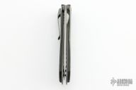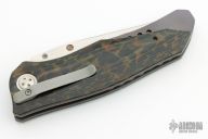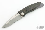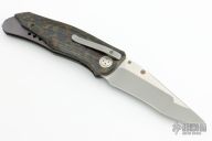 This Warlock Linerlock folder by Allen Elishewitz features a two-tone multi-ground blade with single ramped thumbstud. The handle has a bead blasted and anodized titanium frame with camo micarta scales, tip down stainless steel clip. Gold Elishewitz medallion on back of blade. Nice detent, blade seating and lockup. Has a few light scuffs, otherwise excellent condition.