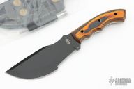 This Micro Tracker by features a back compound blade with a full tang construction. .169" Blade Stock. 1.944"Blade Depth. The handle has wood scales. Includes a brown leather sheath and the original box. Excellent Condition.