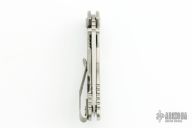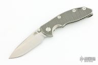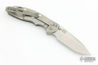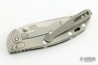This XM-18 from Rick Hinderer features a spear point stonewashed blade with notched thumbrest and dual thumbstuds. The handle has a custom textured titanium scale by Midnight Sun Industries, stonewashed titanium frame, titanium barrel spacers, titanium hardware, titanium Deep Carry pocket clip. Dual thumb studs and notched thumbrest. Reversible pocket clip. Strong lock up, nice detent and blade seating is center. Comes in the original box and extra hardware. Comes with original micarta scale and titanium liner. Excellent condition.
