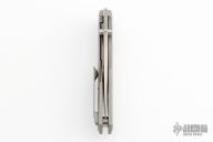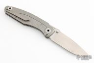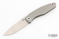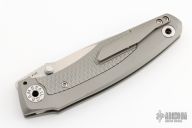 This Knife features a stonewashed blade with dual thumbstuds and a notched thumbrest. The handle features a tumbled titanium frame with a matching tip up pocket clip. Includes a padded zippered case and COA. S/N 138. Excellent Condition.