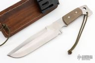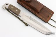 This Trailhound from Relentless Knives features a satin finished blade with a false top edge and some serrations, .245" blade stock and 1.886" blade depth, full tang construction. The handle is comprised of green canvas micarta scales and red liners, lanyard hole in the butt. Comes with a brown leather sheath. Has some light scuffs/scratches, otherwise excellent condition.