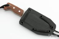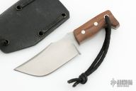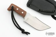 This knife by Relentless Knives features a satin finished blade with false top edge, .134" blade stock and 1.280" blade depth, full tang construction. The handle has wood scales. Comes with a kydex neck sheath. Dated 2003. Has a few light scratches, otheriwse excellent condition.