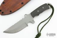 This One Off Prototype from Relentless Knives features a bead blast finished clip point blade with saw teeth on the spine, .218" blade stock and 1.565" blade depth, full tang construction. The handle is comprised of black canvas micarta scales over red liners and full tang construction. Exposed tang pommel with dual lanyard holes and lanyard. Includes a brown leather sheath. Has some light scratches and oxidation, otherwise good condition.