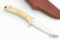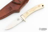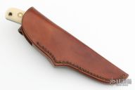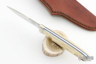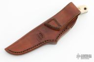 This Bird and Trout knife by Chuck Schuette features a mirror finished drop point blade with notched thumbrest, .098" blade stock and .762" blade depth, full tang construction. The handle has a nickel silver guard, carved cow shin-bone scales with blue liners, and a lanyard hole. Comes with a brown leather sheath. Excellent Condition.