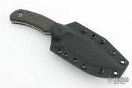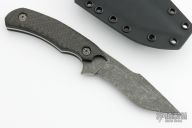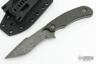 This Hellbound by Jim Skelton features a "Dark Granite" finished blade with false top edge, .145" blade stock and 1.177" blade depth, full tang construction. The handle has carbon fiber scales. Comes with a kydex sheath and a COA. Excellent condition.