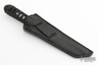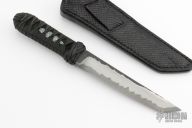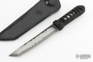 This Kwaiken from Ben Seward features a Damascus core San Mai kwaiken style blade with forge finished flats, .282" Blade stock 1.106" Blade Depth. The handle has a black tsuka ito wrap over black stingray skin. Includes black leather sheath. Excellent condition. Comes with a zippered case.