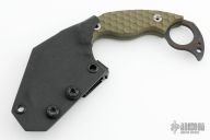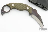 This Karambit by Thompson Knife and Tool features a two-tone finished blade with notched thumbrest and false top edge, .152" blade stock and 1.277" blade depth, full tang construction. The handle has honeycomb green G-10 scales. Comes with a kydex sheath with Ulti-Clip. New from maker. Comes with COA dated 7-24-23