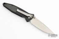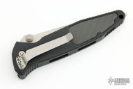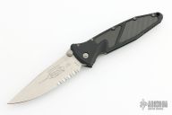 This Socom Elite manual linerlock folder by Microtech Knives has a stonewashed partially serrated blade with notched thumbrest and dual thumbstuds. Has a black aluminum handle with non-slip inlays, tip down blasted stainless steel clip. Serial number 033253 and dated 12/2011. Comes with original box, sheath and papers. Excellent condition.