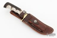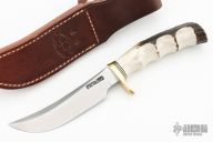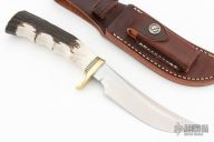 This Model 4-5 by Randall Made Knives features a satin finished blade with false top edge and notched thumbrest, .182" blade thickness and 1.087" blade depth, hidden tang construction. The handle has a brass guard, stag finger grip handle with black/brass spacers. Comes with a brown leather sheath, original paper wrapping and a zippered case. New from maker.