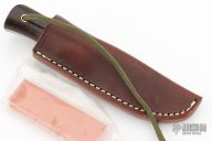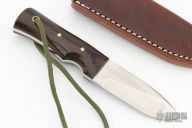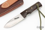 This Model 10-3 by Randall Made Knives features a satin finished blade with notched thumbrest, .141" blade stock and 1.011" blade depth, full tang construction. The handle has rosewood scales with brass pins. Comes with a brown leather sheath, original paper wrapping and a zippered case. New from maker.