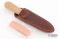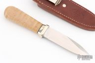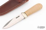 This Gambler by Randall Made Knives features a satin finished blade with .171" blade stock and .985" blade depth, hidden tang construction. Sharpened top edge. Notched thumbrest. Curly Maple grip with nickel silver guard, black spacer. The Gambler is one of Randall's non-catalog knives. Brown leather sheath with boot clip, original paper wrapping and a zippered case. New from maker.
