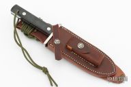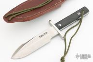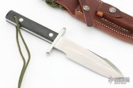 This Model 17 Astro by Randall features a satin finished spear point blade with false top edge, .221" blade stock, 1.408" blade depth, full tang construction. Black linen micarta scales, fastened with removable stainless steel bolts. A slot in the heavy tang and matching hollow inside the handle may be used to carry matches, fishhooks, line and other survival items. The Model 17 was especially designed for the seven Mercury astronauts who carried them on America's first manned space flights. Astronaut Gordon Cooper did the final design, and two of these historically valuable knives are on display in the Smithsonian Institution. Includes brown leather sheath with stone and original paper wrapping. New from maker. Comes with a Randall zippered case.