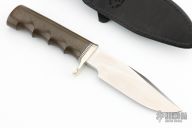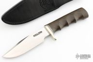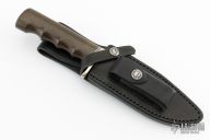 This Sergeant's Special by Randall Made Knife features a satin finished blade with sharpened top edge and a notched thumbrest, .218" blade stock and 1.350" blade depth, hidden tang construction. The handle has a nickel silver guard with a finger grip style green linen micarta grip and black/duralumin spacers. Comes with a black leather sheath and a Randall zippered case. Comes with original paper wrapping. New from maker.