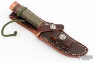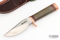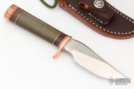 The miniature Model 27 debuted in Randall's 2012 75th anniversary catalog and is the first catalog miniature model. This knife has a 3.5" stainless steel blade, .157" blade stock and 1.056" blade depth, hidden tang construction. The handle has a copper guard and butt, green micarta grip, and black/copper/leather spacer pattern. Comes with a brown leather sheath and original paper wrapping. New from maker.