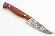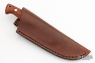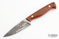 This knife by Bryan Baker features a Damascus blade with .123" blade stock and 1.128" blade depth, full tapered tang construction. The handle hs brown canvas micarta scales with stainless and mosaic pins, lanyard hole. Comes with a brown leather sheath. Excellent condition.