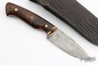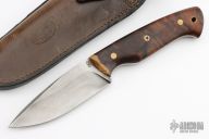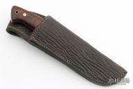 This knife by Bryan Baker features a spear point blade with visible temper line, .161" blade stock and 1.438" blade depth, full tapered tang construction. The handle has desert ironwood scales with brass and mosaic pins, lanyard hole. Comes with a brown leather sheath with shark skin overlay. Excellent condition.