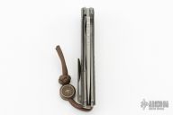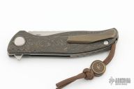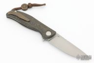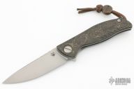 This F3 Flipper from Shirogorov has a tumbled flat ground spear point blade with notched flipper. Handle has carbon fiber scales, tumbled titanium backspacer, tip up clip and liners. Recessed lanyard bail. Dead center blade seating, excellent detent and lockup. Rides on bearings. Excellent condition.