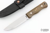 This Scandi Bushcraft Knife by Dave Beck features a hand rub satin finished blade with a scandi grind, .124" blade stock and 1.116" blade depth, full tang construction. The handle has richlite scales with orange liners. Comes with a black leather sheath. New from maker.
