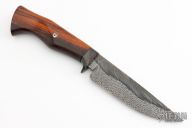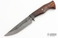 This Riptide Hunter by Journeyman Smith Kelly Vermeer Vella features a "Riptide" Damascus blade with .198" blade stock and 1.234" blade depth, hidden tang construction. Notice the way the pattern of the Damascus follows the shape of the blade all the way to the tip, very cool! The handle has a blued CuMai guard (steel and copper), desert ironwood grip with custom mosaic pin. Comes with a hand tooled brown leather sheath. Comes with zippered case. New from maker!