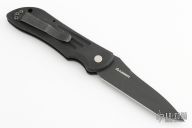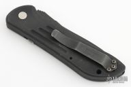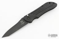 The Model 9100 Auto Stryker is the automatic version of Benchmade's Designer Series Stryker. Designed by Allen Elishewitz, the AutoStryker features a 3.5" 154CM drop point Tanto blade. The handle is made from 6061 T6 aircraft aluminum, hard anodized black for durability. This knife is designed for people who like the features of the Tanto blade shape, but do not want a chisel ground blade; the knife has a double bevel and is symmetrically ground. This one has a black coated blade. Black tip up carry clip. Has some scuffs, otherwise good condition.