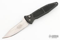 This Mini Socom Auto by Microtech features a hand rub satin finished blade with false top edge and notched thumbrest. The handle has a black aluminum frame with non-slip inserts and a tip down stainless steel clip. Has some scuffs/scratches, otherwise good condition. Comes with original gold box and papers.