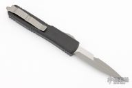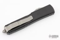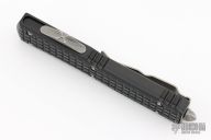 This knife from Microtech was the 2023 Blade Show Special. It has a double edged bayonet ground blade with an Apocalyptic finish. The handle is black frag pattern G-10 and black aluminum with a tip down Apocalyptic stainless clip and glass breaker at the butt. Comes with an original box and papers. New condition.