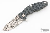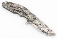 This Jurassic by Hinderer Knives features a laser engraved Digicam blade with notched thumbrest and flipper. The handle has a laser engraved Digicam titanium frame with a black/purple G-10 scale, tip up or down reversible clip and a modular backspacer. Nice detent, lockup and blade seating. Comes with Hinderer box. Excellent condition.