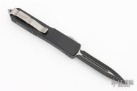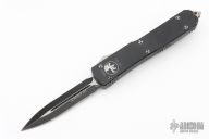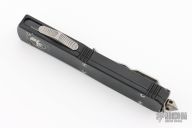 This Ultratech OTF automatic by Microtech knives features a D/E black double edged blade blade with a standard edge, and a black aluminum handle with blasted hardware, tip down carry. Glass breaker. S/N 38880. Dated 09/2013. Comes with original box, sheath and papers. Has some scuffs, scratches and dings, otherwise good user condition.