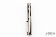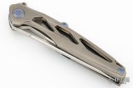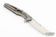 This Knight by Rike knives features a Damasteel blade with milled thumbrest, thumbhole and flipper. The handle has milled and blasted titanium frame with matching tip up clip. Has a stainless lockface insert. Comes with nylon zippered case. Rides on bearings, nice detent, lockup and blade seating. Excellent condition.