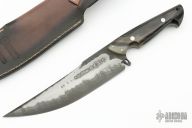 This Macho Rio Jano "El Forajido" by Miguel Barbudo features a San Mai Damascus blade (420mn and C130) with fullers and false top edge, .223" blade stock and 1.883" blade depth, full tang construction. The handle has "Fighting Bull Horn" scales with a lanyard hole at the butt. Comes with a hand tooled brown leather sheath. Comes with original box and COA dated May 5, 2023. New from maker!