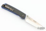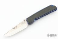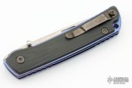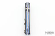 This Higo II from Rockstead features a two-tone drop point blade with mirror polished grinds, dual thumb studs and notched thumbrest. The handle is comprised of carbon fiber scales over anodized titanium liners and a single barrel spacer. Lanyard hole in pommel. Has some light scuffs and scratches, has a couple nicks in the blade edge, otherwise good user condition.