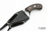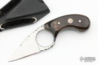 This custom version of Fred Perrin's popular La Griffe features a mirror polished blade with fileworked spine and finger hole, buffalo horn scales with blue liners and mother of pearl inlays, full tang construction, .121" blade thickness and 1.250" blade depth. Nice fit in the hand. Includes kydex neck sheath. Has some light scratches, otherwise excellent condition.