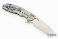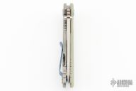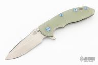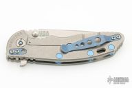 This XM-18 flipper from Rick Hinderer Knives features a 3.5" tumble blade, notched thumbrest and flipper, dual thumbstuds. The handle has a jade G-10 scale, and stonewash titanium handle. Blue hardware and clip. Clip can be mounted for tip up or down carry. Nice lockup, seating, and detent. Includes Hinderer box. Excellent condition.