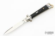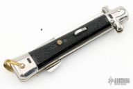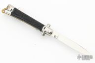 This Automatic by Bargeon features a mirror finished drop point blade with swedge. The handle has stainless steel bolsters and pommel with checkered plastic scales over coin edged brass liners and stainless steel lockbar. Push button release, sliding safety and brass lanyard bail. Has a few light scratches, otherwise excellent condition.
