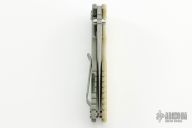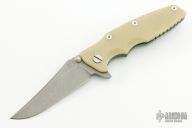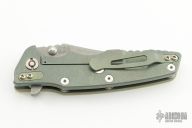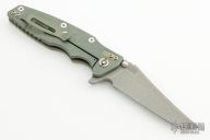 This Eklipse Flipper by Rick Hinderer Knives features a 3.5" working finished blade, notched thumbrest and flipper, dual thumbstuds. The handle has a bone G-10 scale, and battle green titanium handle/clip. Clip can be mounted for tip up or down carry. Nice lockup, seating, and detent. Comes Hinderer box and papers. Excellent condition.