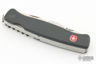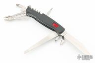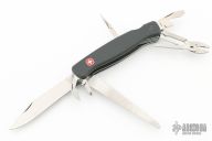 The Wenger Everest is a retired, 125mm locking-blade Swiss Army knife with a locking blade, wood saw, pliers and basic tools. Most of its tools are oversized, but the pliers are the same size as the one on 85mm models. That leaves enough room for a short, end-mounted Phillips screwdriver in the same layer. Comes with a velcro case. Excellent condition.
