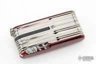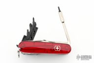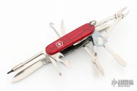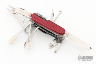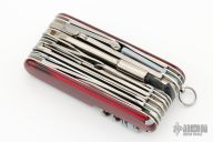 Victorinox SwissChamp XLT 91mm - Ruby Red Translucent Handle When you think of a Swiss Army Knife, chances are good that you think of the legendary Swiss Officer's knife. Now the legend continues with the Swiss Champ XLT pocket knife. Many aficionados claim it's the ultimate pocket knife, packing no less than 49 functions and countless possibilities. Wherever you are and whatever happens, if it can be fixed, most likely it can be fixed with the Swiss Champ XLT. Product Detail: Large blade Small blade Nail file with Metal file Nail cleaner Metal saw Pharmaceutical spatula Scissors Wood saw Fishscaler with hook disgorger ruler (cm & inches) Pruning blade Electrician's blade with wire scraper Case and Wrench with -5mm female Hex drive for D-SUB connectors -4mm female Hex drive for the bits -Bit Phillips 0 (Pozidrive) -Bit Phillips 1 (Pozidrive) -Bit Slotted 4 mm -Bit Phillips 2 -Bit Hex 4 mm -Bit Torx 8 -Bit Torx 10 -Bit Torx 15 Pliers with -wire cutters -wire crimping tool Clear magnifying lens Phillips screwdriver Cap lifter with -screwdriver 6 mm -wire bender Can opener with small screwdriver 3mm Corkscrew Chisel Universal Hook (also parcel carrier) Fine screwdriver 2 mm Reamer Punch and sewing eye Key ring Tweezers Toothpick Ball point pen - also to set DIP-Switches Pin Mini-screwdriver Manufacturer lifetime warranty 91 mm | 3 1/2 inch Comes with original sheath. Excellent condition. (Photographers note: Did not open all blades and tools for photos because of time constraints. All are in stated condition.)