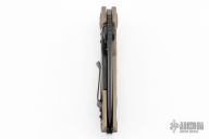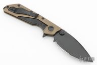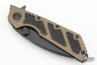 This DOC Framelock Flipper is a collaboration between A. Marfione and M. Strider, their names are on the clip. The blade is black with a partially serrated edge, dual thumb-studs, flipper and a notched thumb-rest. The handle is tan aluminum with non-slip inserts, and a black stainless steel clip, tip up carry. All black hardware. Comes with original box. Dated 10/2015 and serial number 4902. Excellent condition.