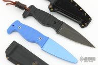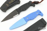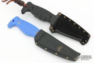 Has a black stonewashed blade with .160" blade stock and 1.208" blade depth, full tang construction with black G-10 scales. Comes with an ambidextrous kydex sheath with velcro loops on one side and a metal clip on the other. The sheath also holds a fire steel in the sheath. Comes with matching trainer. Comes with original box and papers. Excellent condition.