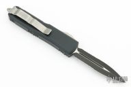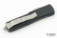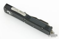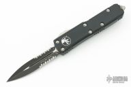 This UTX-85 OTF automatic by Microtech knives features a D/E black double edged partially serrated blade with a standard edge, and a black aluminum handle with blasted hardware, tip down carry. Glass breaker. S/N 19052. Dated 09/2018. Comes with original box and papers. Has a couple light scuffs, otherwise excellent condition.
