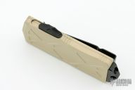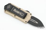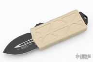 This Microtech Exocet features a black double edged blade. The handle has a bronze colored aluminum handles and a stainless clip that doubles as a money clip dated 05/2021 s/n 024. Comes with original box and papers. Excellent Condition.