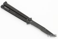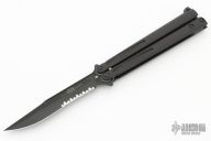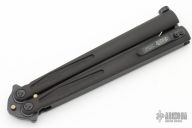 This Tachyon III balisong by Marfione Custom Knives has a black clip point partially serrated blade with false top edge. The handles are black aluminum with spring latch and tip up pocket clip, black hardware. Rides on bearings, no blade play, very smooth. S/N 02508 and dated 09/2017. Comes with original box and papers. Excellent condition.