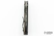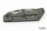This Mick Strider SMF framelock folder features a tiger striped blade with thumbhole and notched thumbrest. The handle has a black aluminum and flamed titanium frame with titanium clip, tip up carry. Jimping on blade spine. Nice lockup, detent, and blade seating. Excellent condition.