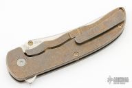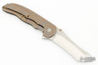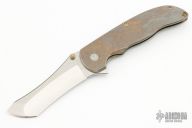 This Norseman (#2809) by John Grimsmo features a stonewashed blade with a single anodized titanium thumb stud, notched thumb ramp and flipper. Stonewash and anodized finished titanium frame with anodized titanium screws. Has a matching clip with hidden screws. Very smooth action that requires no wrist movement. Nice detent, lockup and blade seating. Rides on ceramic bearings. Comes with original packaging, custom hard case, Nano-Oil, tool, and COA dated Sept 24, 2019. Excellent condition.