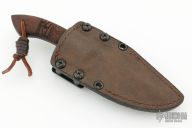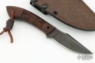 Jason Knight Design by Winkler Knives. Black blade with notched thumbrest, .162" blade stock and .977" blade depth, full tang construction. The handle has tribal pattern maple scales. Comes with original box, sheath and papers. Excellent condition.
