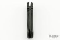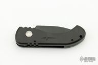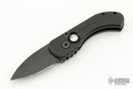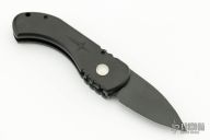 This California Special button lock auto has a black blade. Handle is black anodized aluminum. Frame shows signs of wear at the corners, but blade is in great shape and action/ lockup is perfect. Good condition.