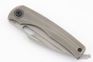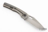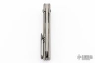 This BBM V2 by Nick Chuprin and Robert Carter features an acid etched blade with fullers, thumbhole and milled bevels. The handle has an acid etched titanium frame, black titanium pivot, screws, zirconium pivot collar, backspacer and tip up clip with hidden screws. Rides on bearings, nice detent, lockup and blade seating. Comes with a zippered case. Excellent condition.
