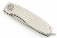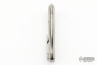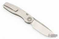 This FSD by Craig Brown Knives features a drop point stonewashed polish blade and notched flipper and fullers. The handle has a tumbled titanium frame with milling style #1, titanium tip up clip and backspacer. Nice detent, action, blade seating and lock up. Comes with original hard case with certificate #220. Excellent condition.